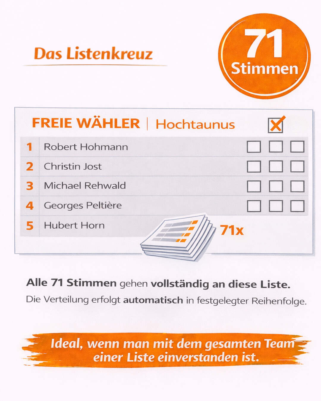 Eine Möglichkeit der Stimmabgabe ist das Listenkreuz. Wer sich für diese Variante entscheidet, setzt ein Kreuz bei einer Partei oder Wählergruppe. In diesem Fall werden alle 71 Stimmen automatisch dieser Liste zugeordnet und in der dort festgelegten Reihenfolge auf die Kandidaten verteilt. Diese Form der Stimmabgabe eignet sich vor allem dann, wenn man mit dem gesamten Team einer Liste einverstanden ist.