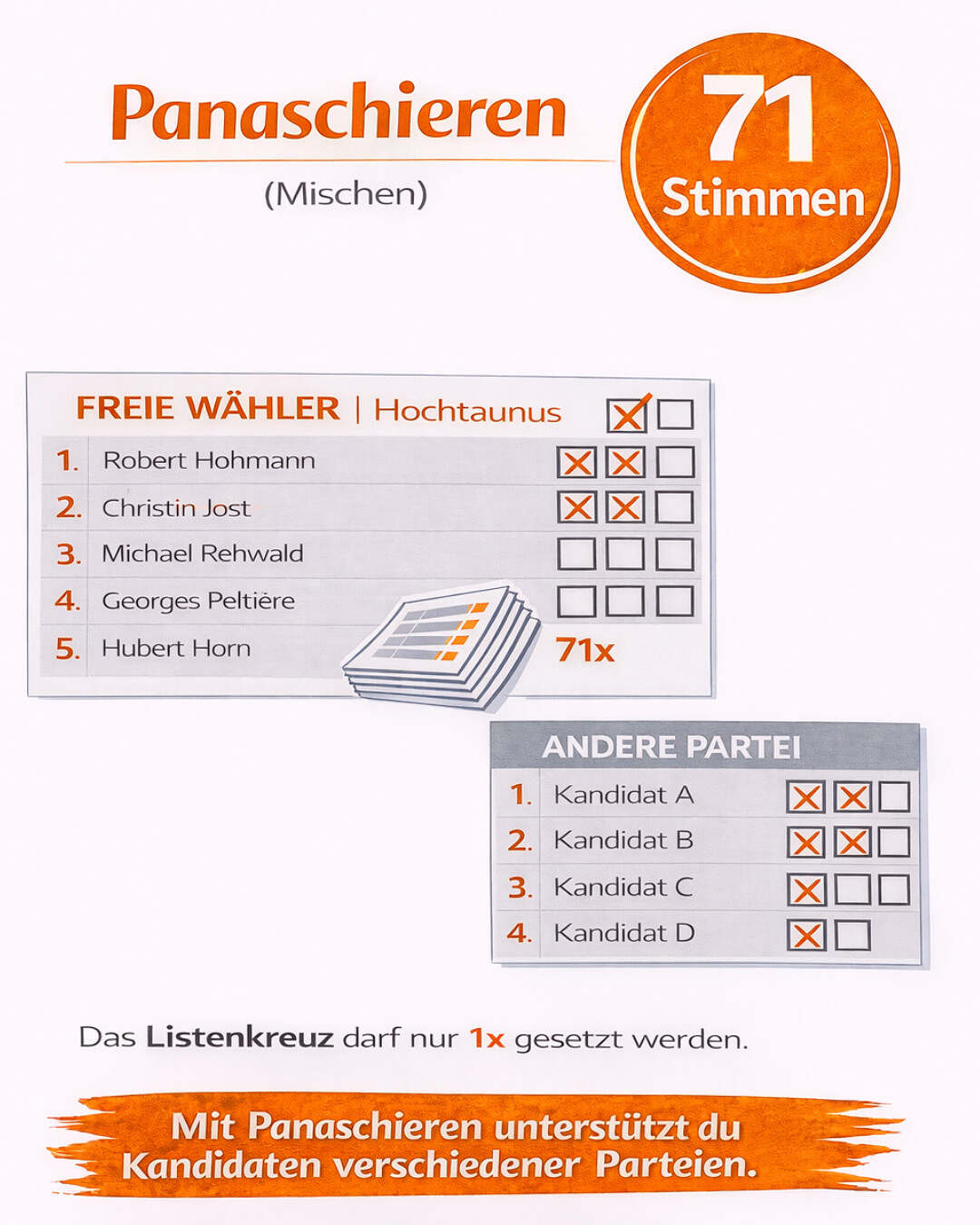 Eine weitere Besonderheit der Kommunalwahl in Hessen ist das Panaschieren. Panaschieren bedeutet, dass Stimmen auf Kandidaten verschiedener Parteien oder Wählergruppen verteilt werden können. Die Wähler sind dabei nicht an eine einzige Liste gebunden, sondern können ihre 71 Stimmen frei mischen. Maßgeblich ist nicht das Parteilogo, sondern die Person, die überzeugt.